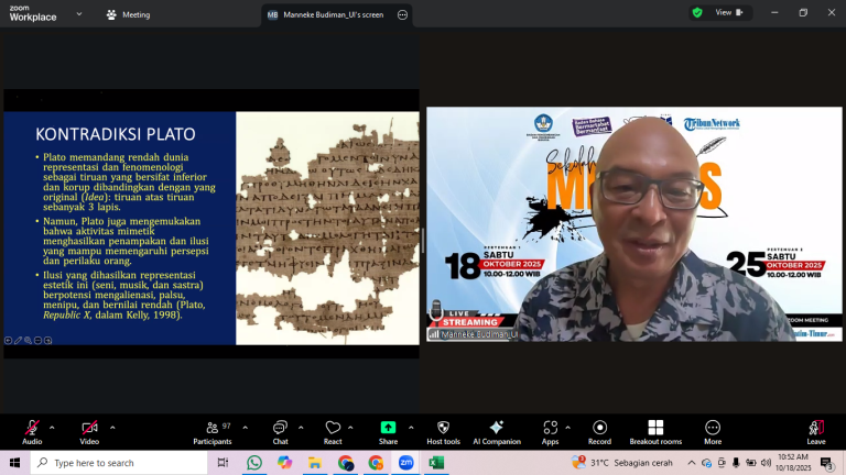 Dalam sesi inti, Prof. Manneke Budiman menyampaikan materi bertajuk “Mimesis Sesi 1”, yang mengupas makna mimesis sebagai praktik representasi terhadap dunia nyata, baik melalui penggambaran alam, proses, maupun pengalaman manusia. Ia menekankan bahwa mimesis tidak hanya berfungsi sebagai peniruan, tetapi juga sebagai sarana manusia untuk memahami dan menciptakan realitas kulturalnya.