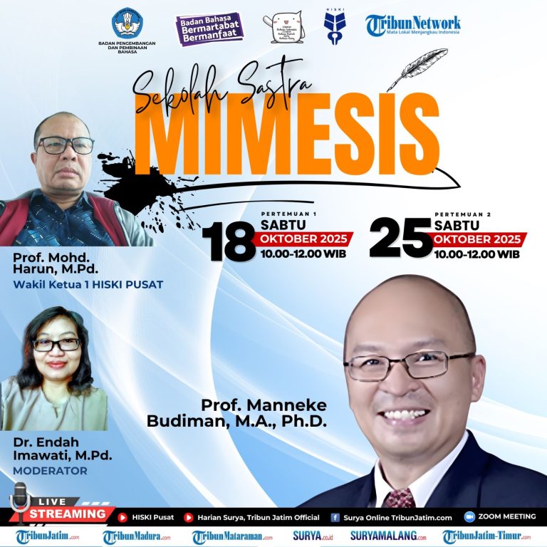 Himpunan Sarjana-Kesusastraan Indonesia (HISKI) kembali menyelenggarakan program unggulannya, Sekolah Sastra, yang kali ini mengangkat topik Mimesis sebagai bahasan utama. Kegiatan ini dilaksanakan secara daring melalui platform Zoom Meeting dan disiarkan secara langsung melalui kanal YouTube HISKI Pusat serta Tribun Network pada Sabtu, 18 Oktober 2025.